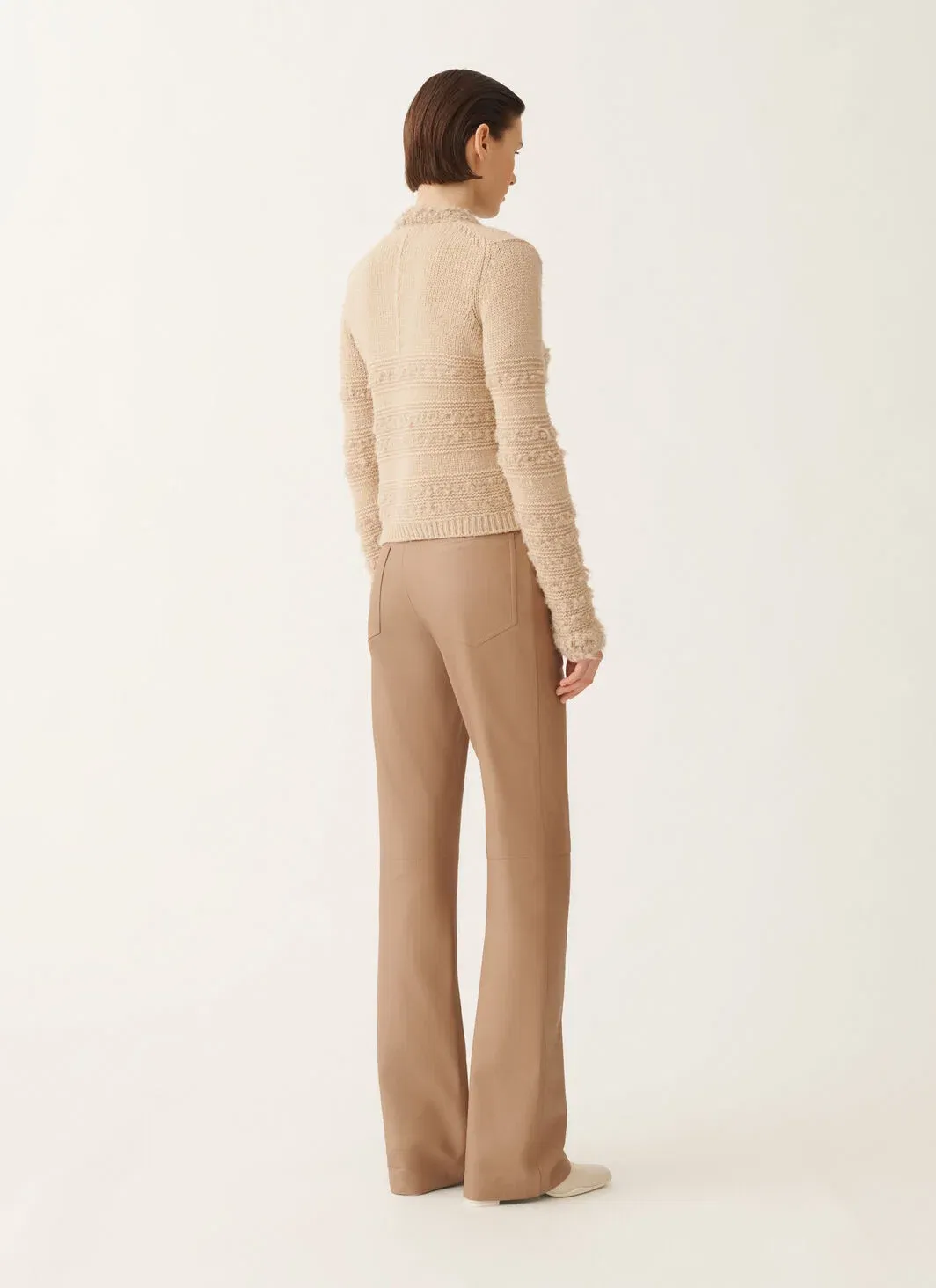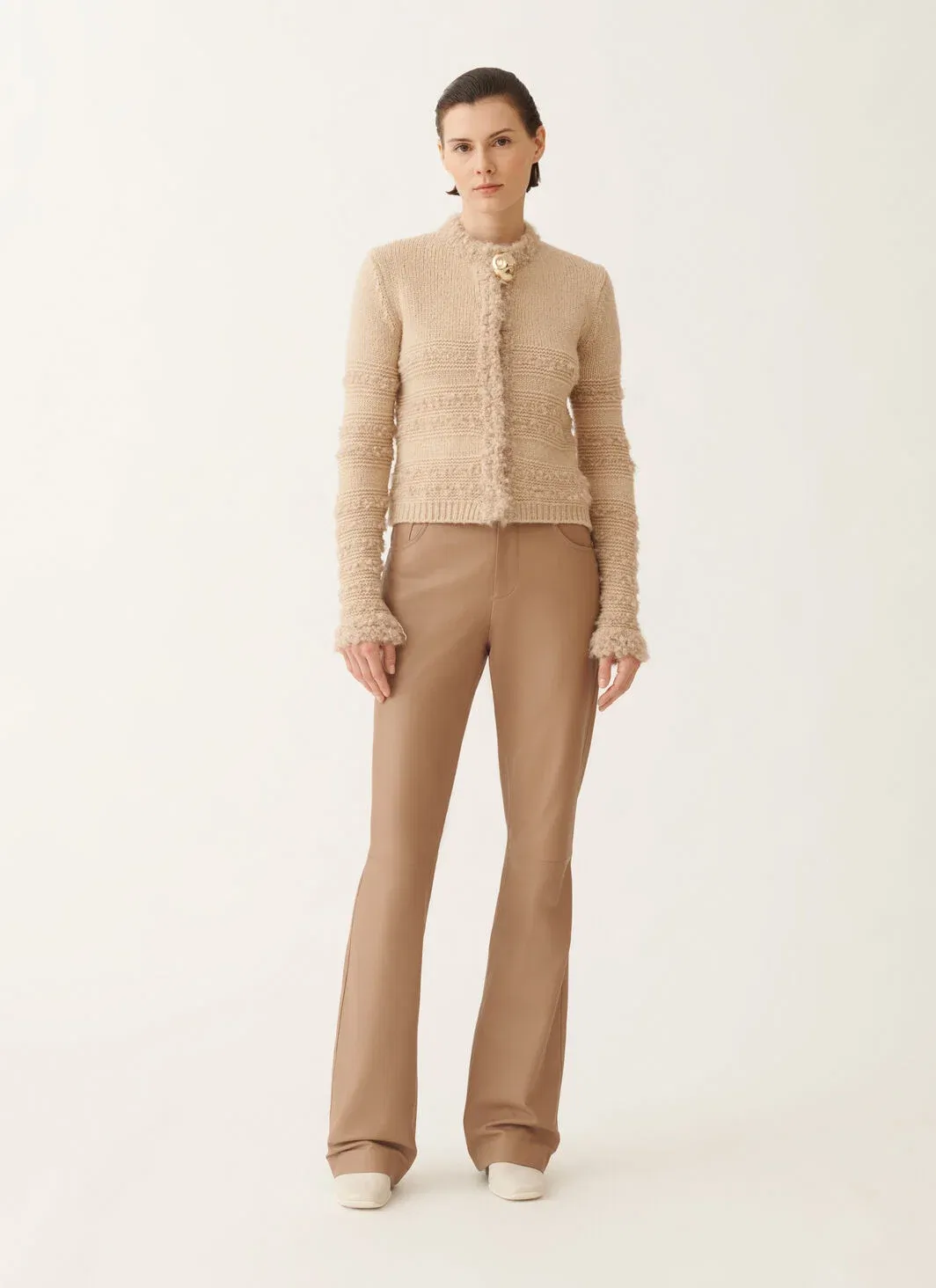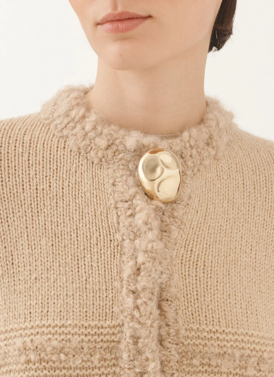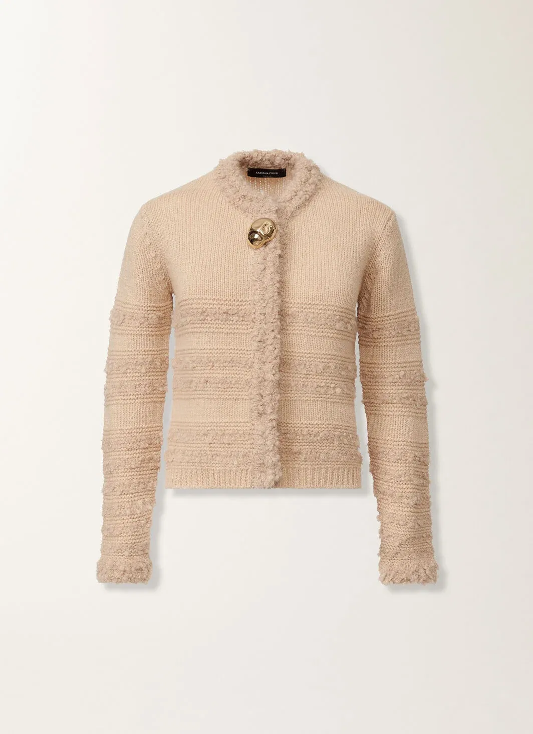 This crew-neck cardigan, made of exclusive pure camel chain-stitch yarn, selected from the finest fibres, offers lightness, volume and a handcrafted touch. Produced entirely in Italy through sustainable processes.