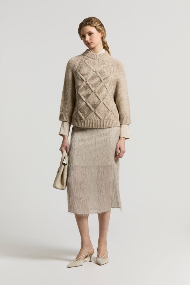 This alpaca and virgin wool yarn jumper features a diamond design, each of which is embellished with a hand-embroidered chain with Punto Luce accent, a process that requires special craftsmanship expertise.
