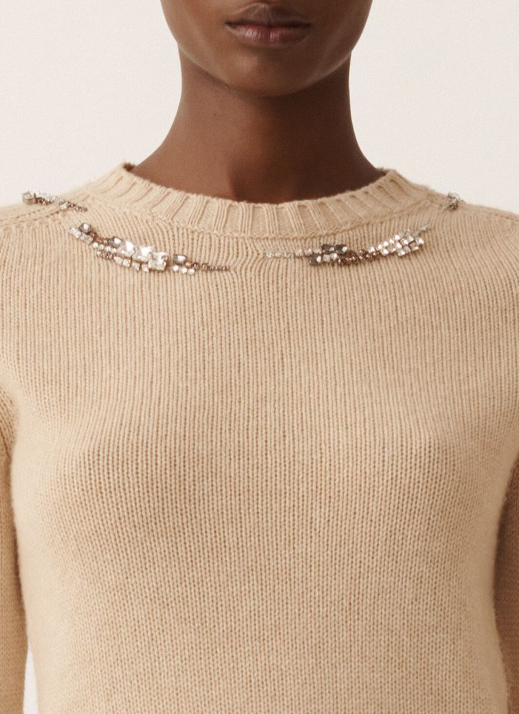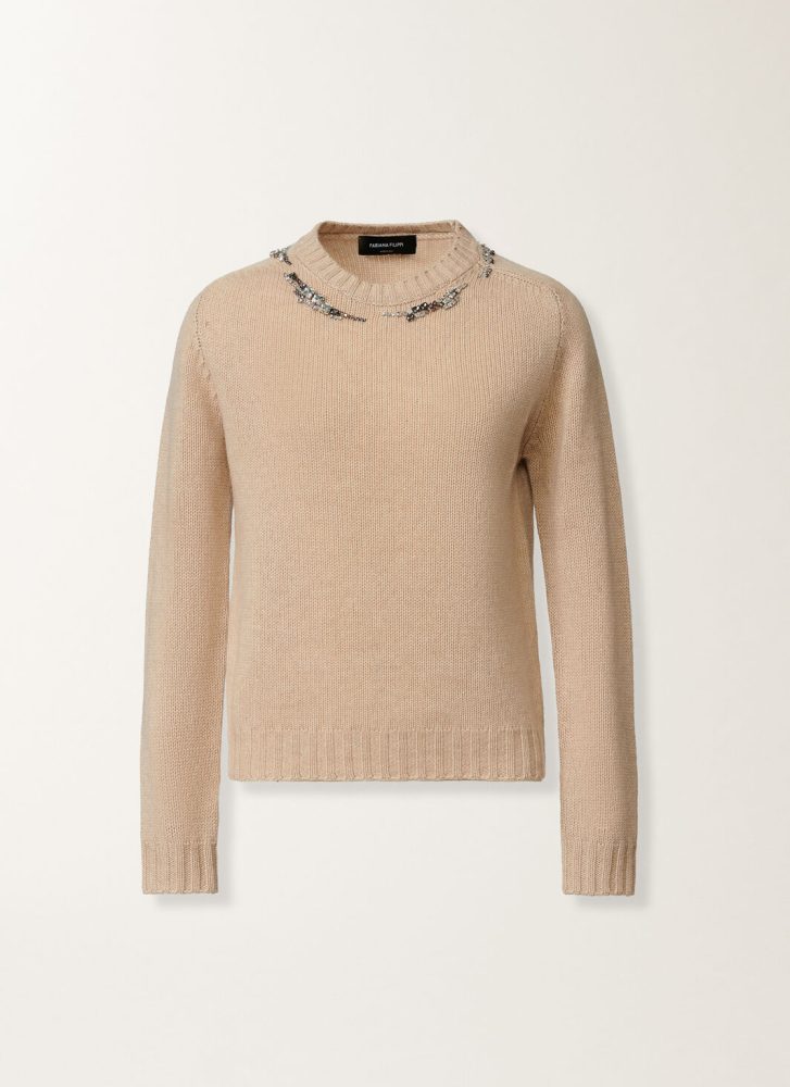 Made in Platinum, Fabiana Filippi’s exclusive yarn combining wool, cashmere, and silk, this elbow-sleeve sweater is enriched with a jeweled flame embroidery reminiscent of the jewel burns from the pre-collection inspired by Alberto Burri. The rhinestone pattern evokes fire tongues in ash and spark tones. Entirely made in Italy through sustainable processes.